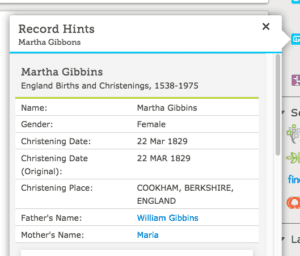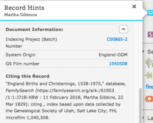 If searching at home how can you tell more records are available at an Affiliate Library for FamilySearch? In this example of a hint, you can see the indexed details for Martha Gibbins.